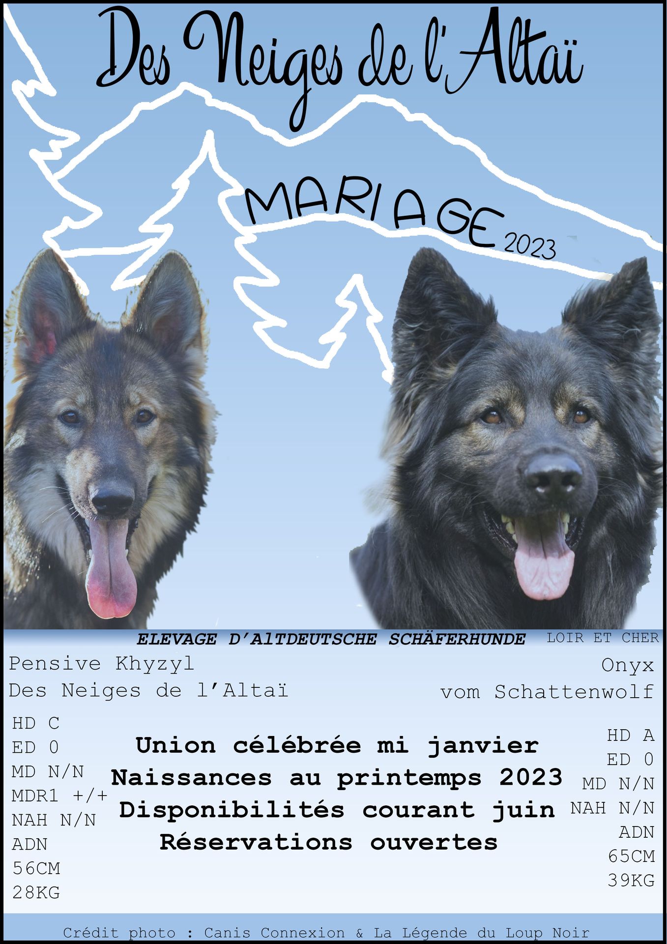 Le mariage devrait donner des loulous très calmes, de tempérament posé, très amicaux. Onyx devrait ramener un côté joueur et compenser la finesse de Khyzyl par une masse un peu plus présente. Le mariage a été déjà effectué en 2021 avec des chiots bien dans leur peau et bien équilibré, le mariage fut alors renouvelé en 2023.